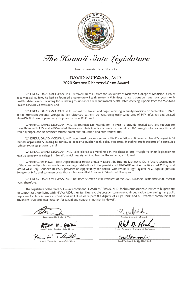 For the past 40 years, McEwan has provided vital contributions to HIV/AIDS care and prevention services in Hawai’i. As the first physician in the state to care for persons with HIV/AIDS, he has dedicated his professional life to providing excellent care and to educating clinicians in the state on how to best provide care for their patients with HIV/AIDS. In addition to serving as one of the few providers of quality HIV primary care in the state, he has and continues to be a unique contributor to HIV care through his advocacy role. He co-founded Hawai’i’s first AIDS Service Organization (ASO), the Life Foundation (now Hawai’i Health & Harm Reduction Center) on O‘ahu. This was one of the first ASO’s in the nation and it continues to provide essential case management, prevention, and support services for persons living with HIV/AIDS.